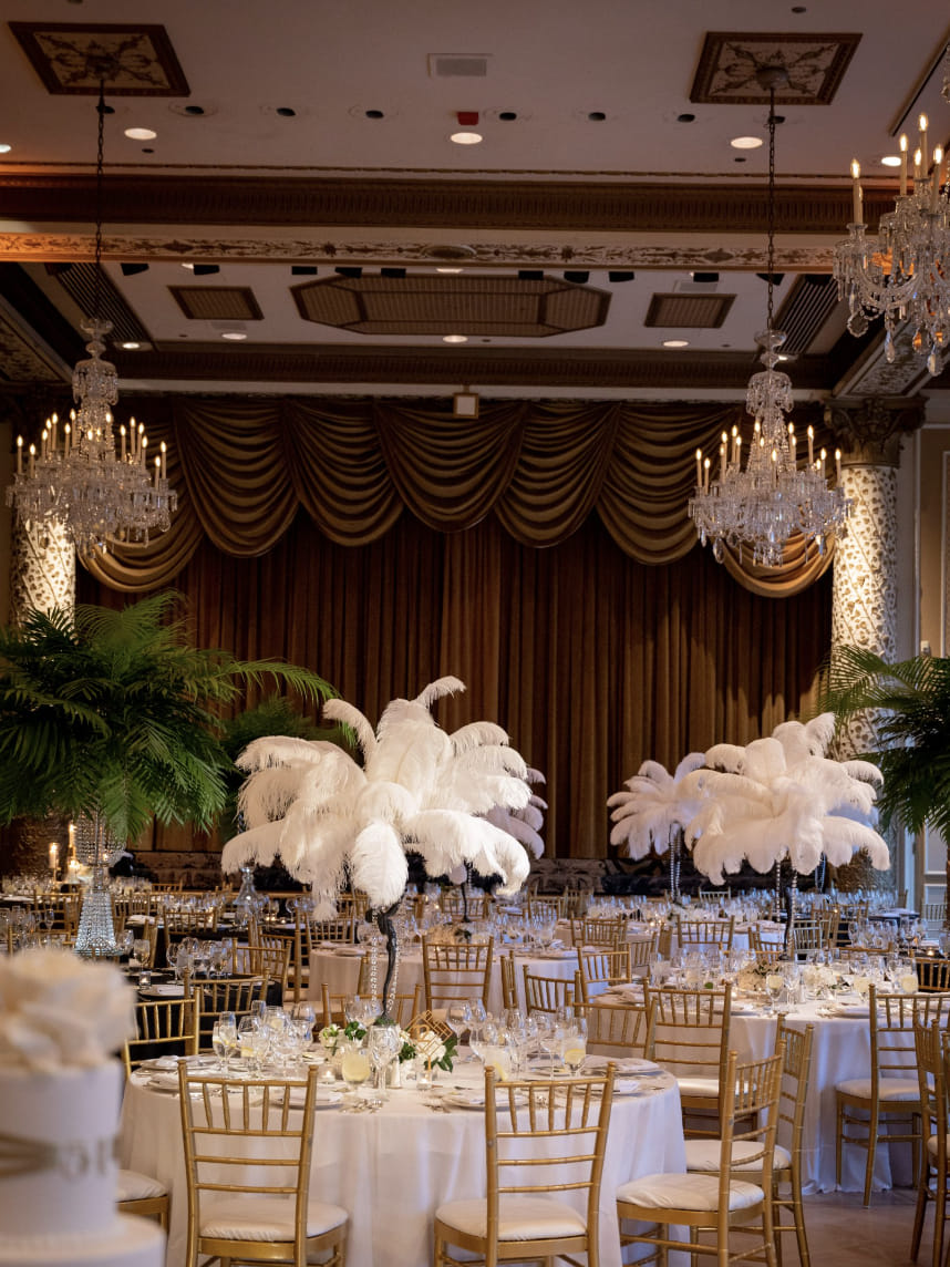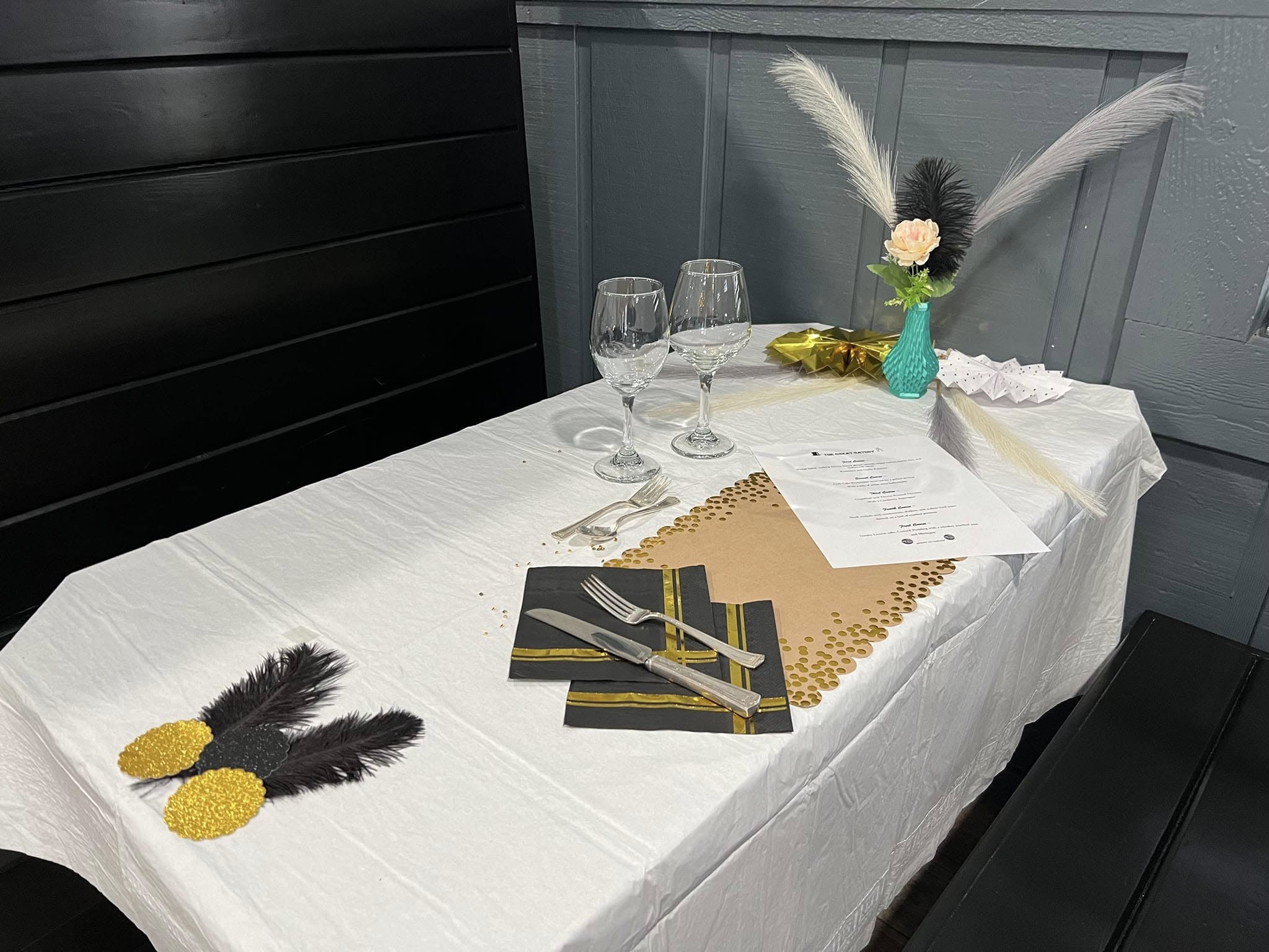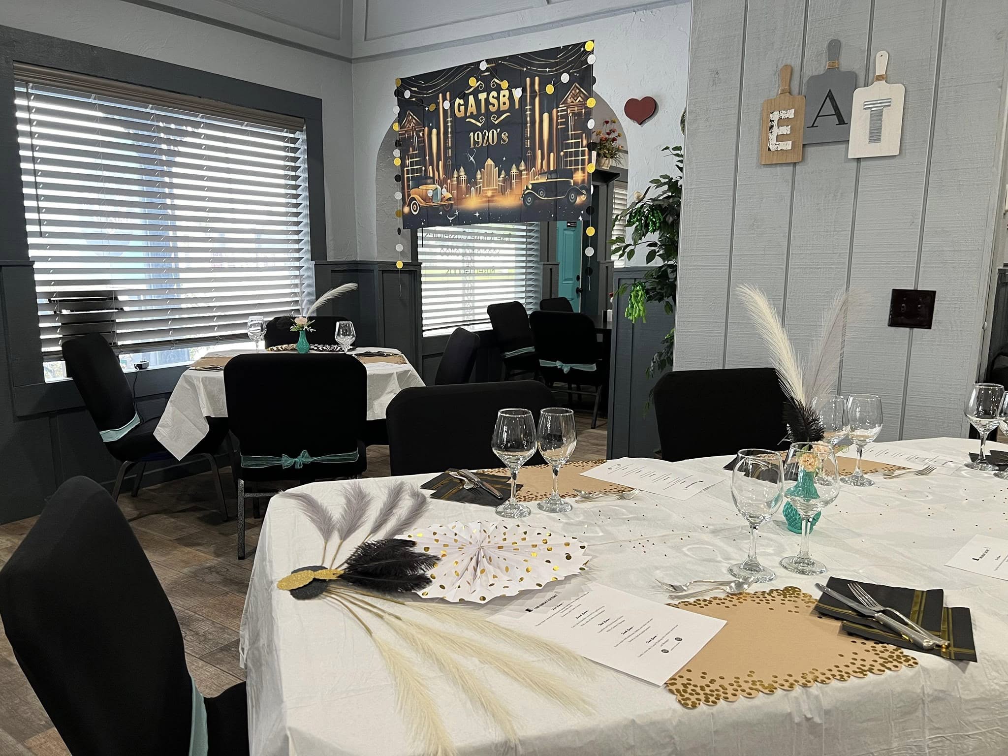 A Great Gatsby-themed dinner party evokes the opulence and glamour of the 1920s Jazz Age, blending Art Deco elegance with Prohibition-era flair. The setting is typically adorned with black-and-gold color palettes, geometric patterns, mirrored tabletops, and feathered centerpieces—often featuring ostrich or exotic feathers for a dramatic effect. Dim lighting, strings of pearls, and hanging paper lanterns enhance the mysterious, luxurious atmosphere, while Art Deco name cards, fluted glassware, and crystal bowls add authenticity.