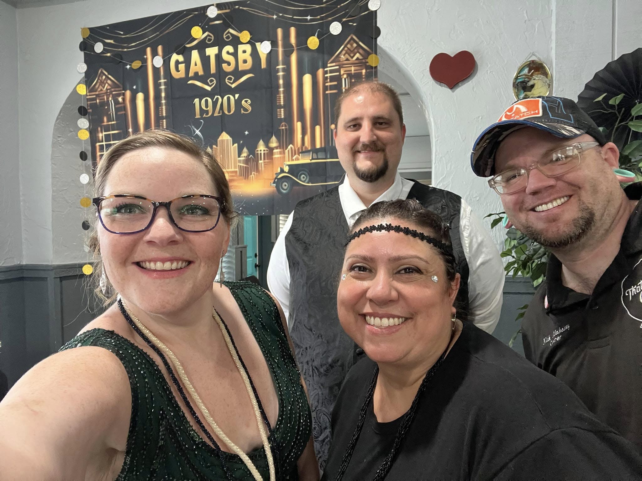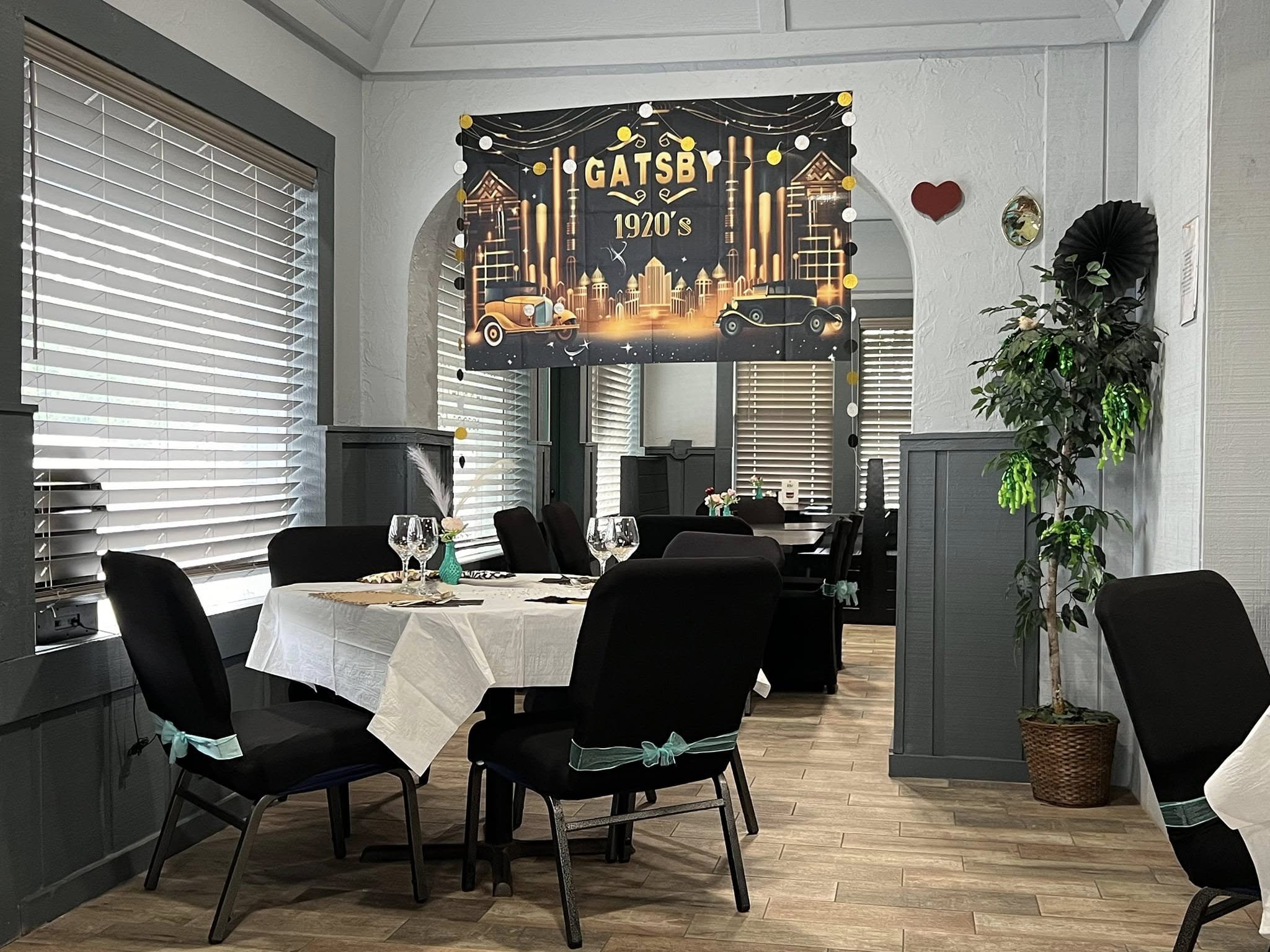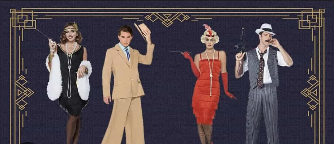 Guests are encouraged to dress in flapper dresses, tuxedos, fedoras, or sequined robes, with accessories like pearl necklaces, cigarette holders, and jeweled headbands completing the look.